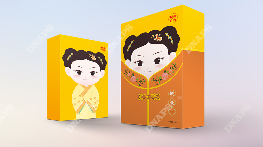 區(qū)別于傳統(tǒng)小米包裝,根據(jù)小米的不同搭配將小米分為月子米,成長(zhǎng)米,養(yǎng)顏米3類(lèi),視覺(jué)上分別以成對(duì)的嬰兒、小孩、年輕女性/媽媽為主要形象元素,采用現(xiàn)代插畫(huà)的形式創(chuàng)造三組萌趣生動(dòng)的形象,畫(huà)面生動(dòng)富有張力,配色清醒典雅,增強(qiáng)產(chǎn)品親和力。包裝盒外加設(shè)計(jì)有古典服飾圖形的封套,整體形式新穎富有層次感,拆掉封套將呈現(xiàn)另一幅畫(huà)面,開(kāi)盒有趣味,讓整體形成記憶點(diǎn)。